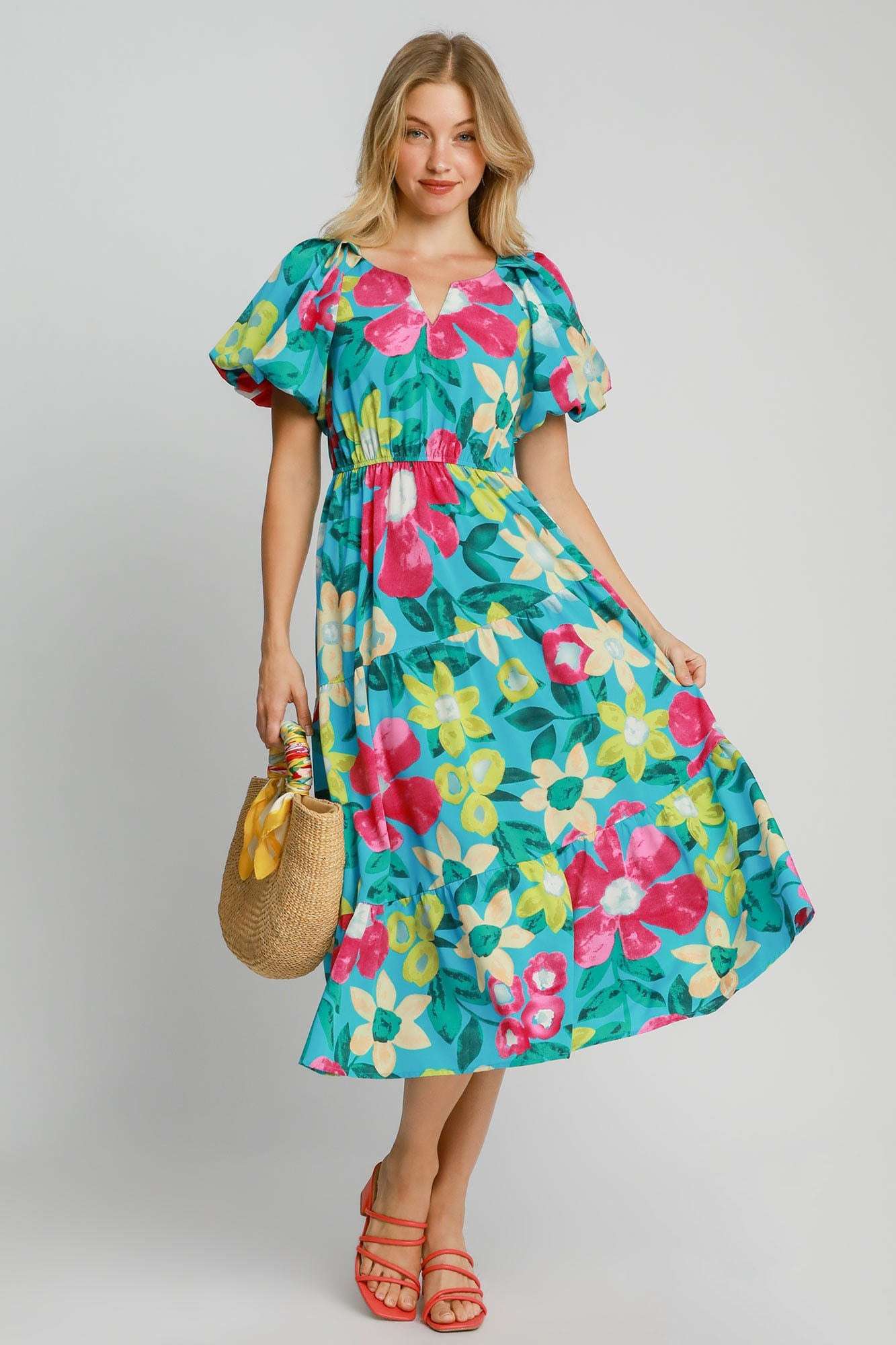 • Umgee Full Size Tiered Floral Print Notched Puff Sleeve Midi Dress Plus Size