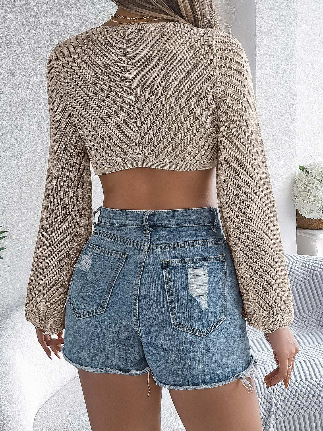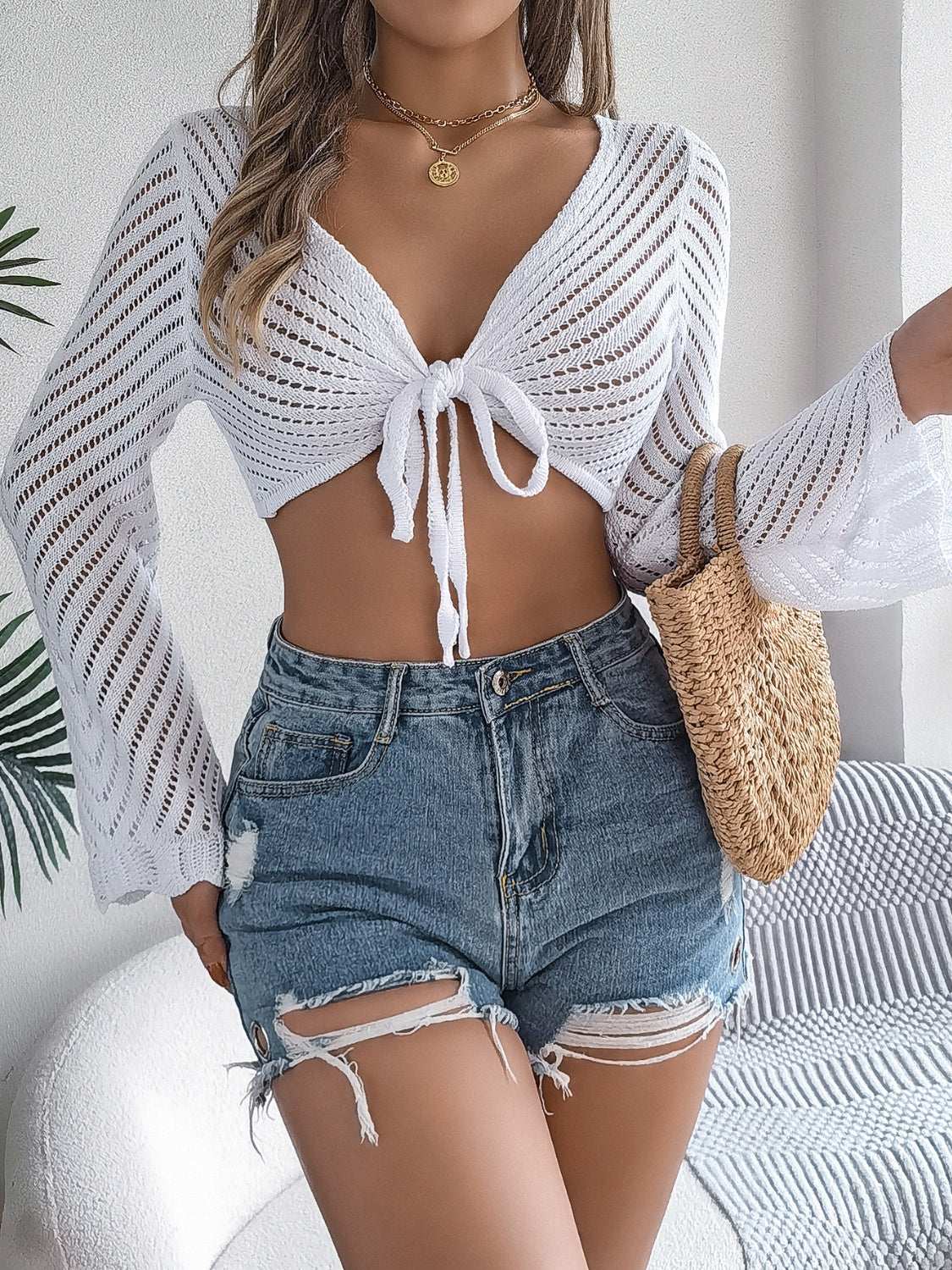 • Openwork Tied Long Sleeve Knit Cover Up